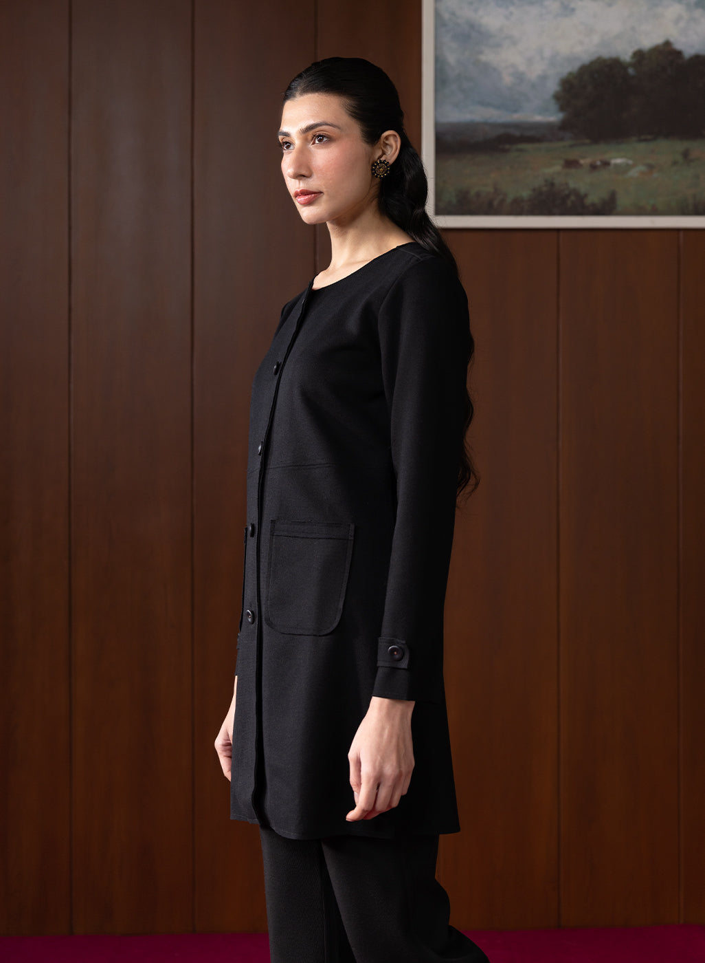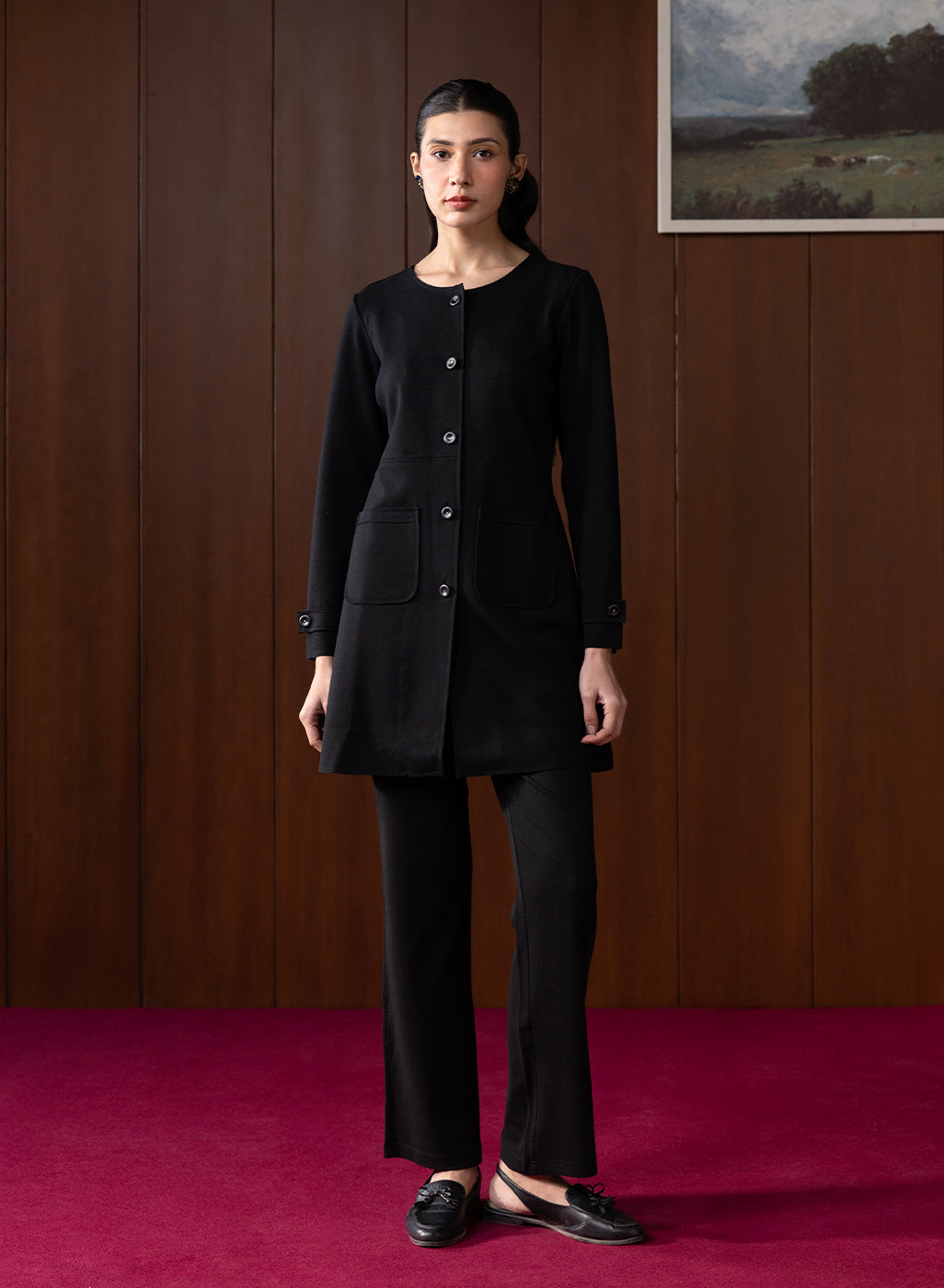Classic, sleek, and oh-so-versatile, this black wool coat is your timeless winter staple. Designed in a straight silhouette with a clean round neckline, it’s that piece you’ll reach for when you want to look polished without trying too hard. The monochrome buttons and minimal patch pockets add just the right amount of detail to keep things elegant.