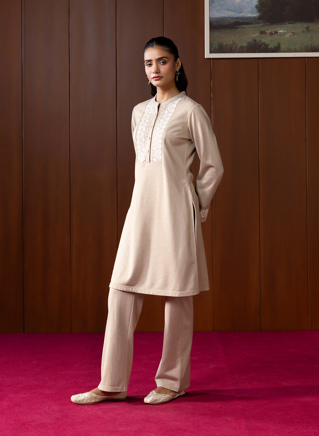 In a sophisticated muted grey, this wool kurta defines understated winter luxury. The beautifully embroidered neck panel and cuff details stand out with refined contrast, bringing a touch of artistry to the minimal silhouette. Crafted from plush wool, it offers exceptional warmth while maintaining a sleek, polished look—perfect for elevated everyday dressing.