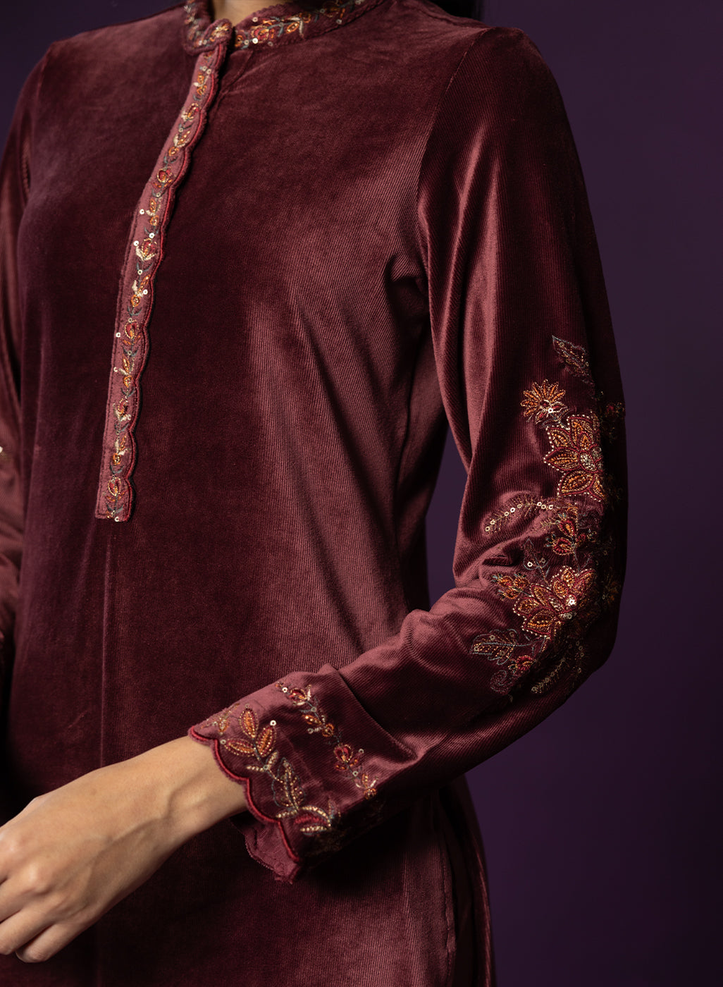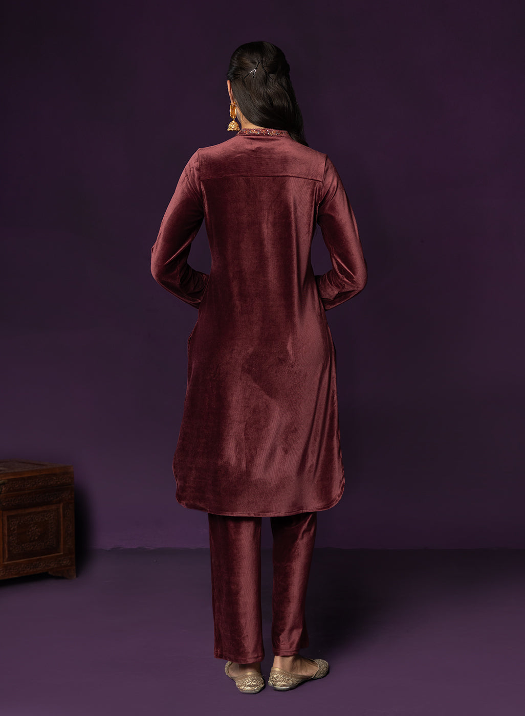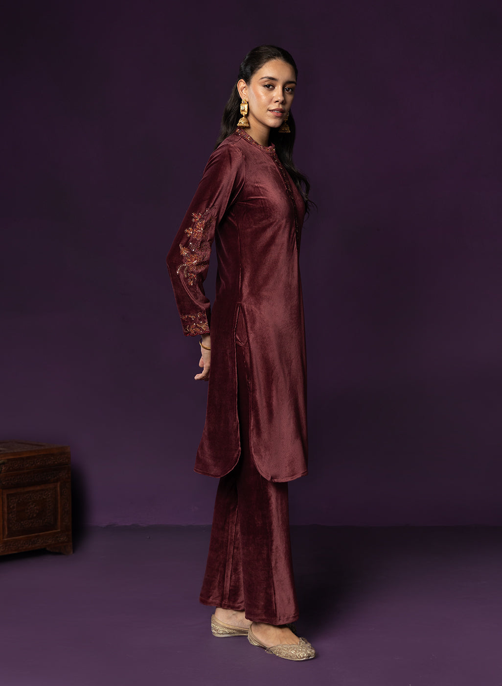 Understated yet effortlessly elegant, this maroon velvet co-ord set celebrates the beauty of simplicity with a hint of regal glam. The rich velvet fabric is adorned with intricate resham embroidery and subtle zari and sequin highlights that never feel too loud, yet remain impossible to miss. Designed with clean lines and refined detailing, it’s a piece that lets its quiet elegance speak for itself.