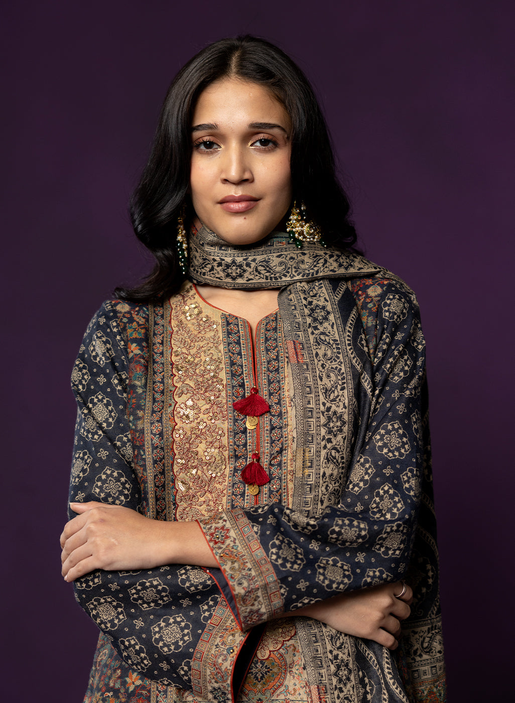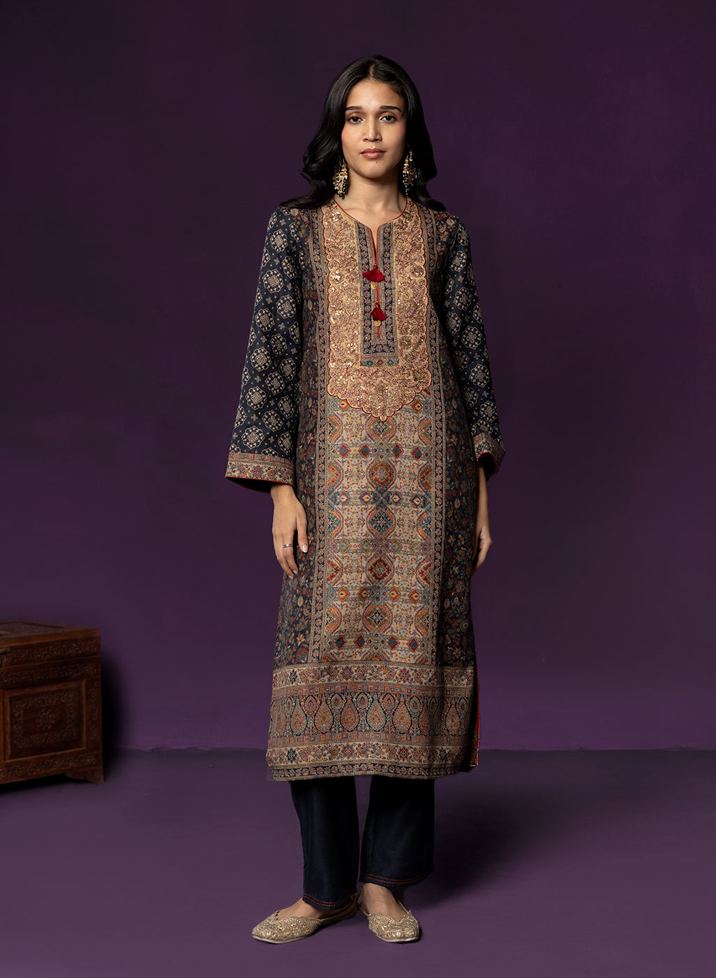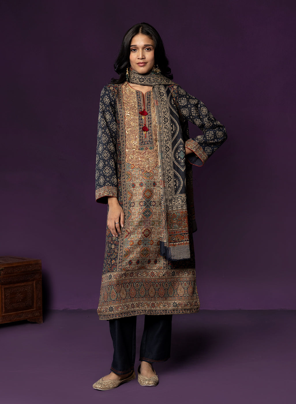 This regal Jamawar set brings together rich patterns and a hint of shimmer on a stunning blue base. The metallic dori embroidery with sequin highlights on the yoke catches light beautifully, adding a regal touch to the intricate woven base. Finished with contrast piping and playful thread tassels, it’s a blend of traditional craftsmanship and easy sophistication that never goes out of style.