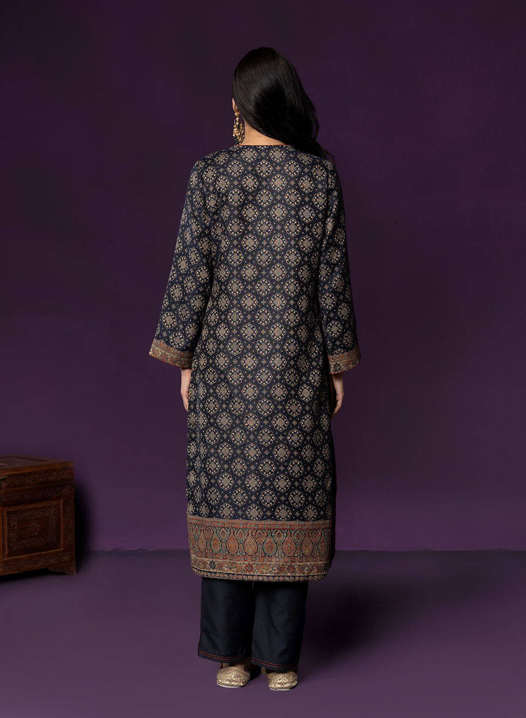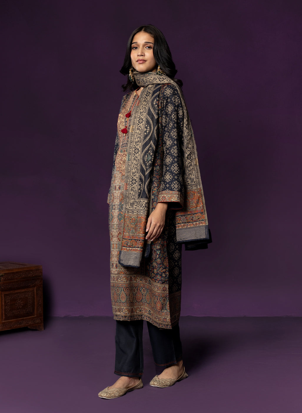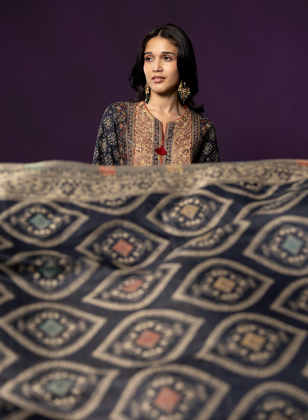 This regal Jamawar set brings together rich patterns and a hint of shimmer on a stunning blue base. The metallic dori embroidery with sequin highlights on the yoke catches light beautifully, adding a regal touch to the intricate woven base. Finished with contrast piping and playful thread tassels, it’s a blend of traditional craftsmanship and easy sophistication that never goes out of style.