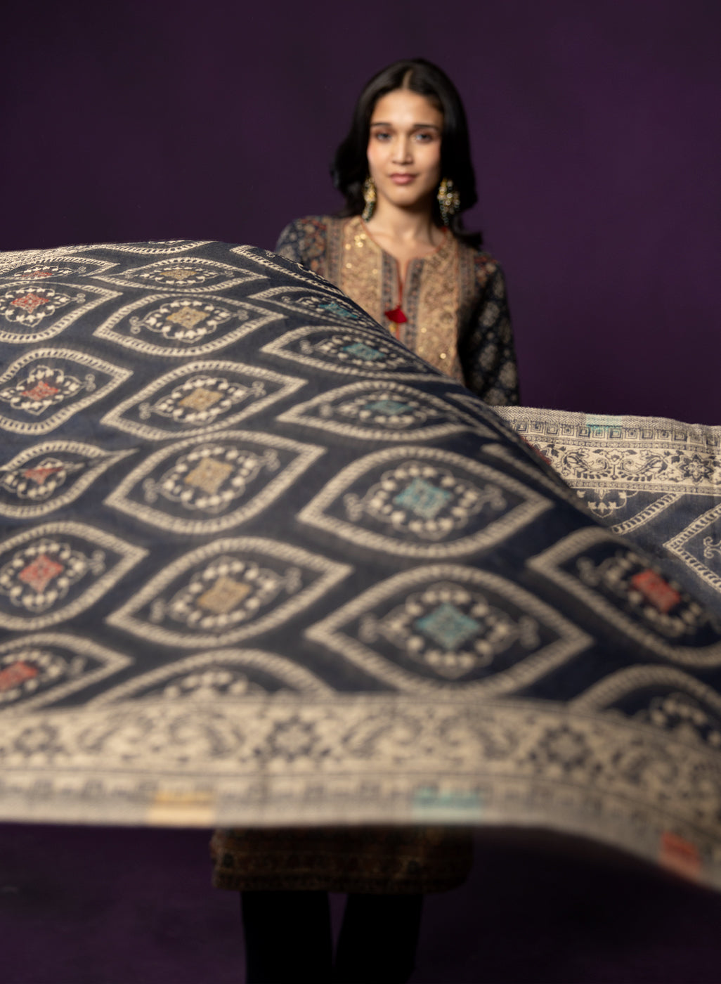- Luxurious woven Jamawar fabric with a soft, warm texture
