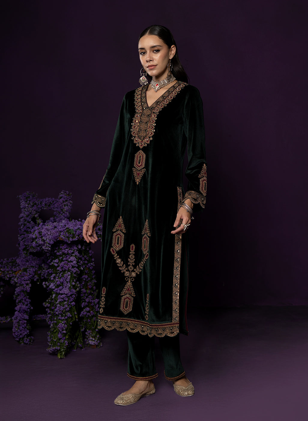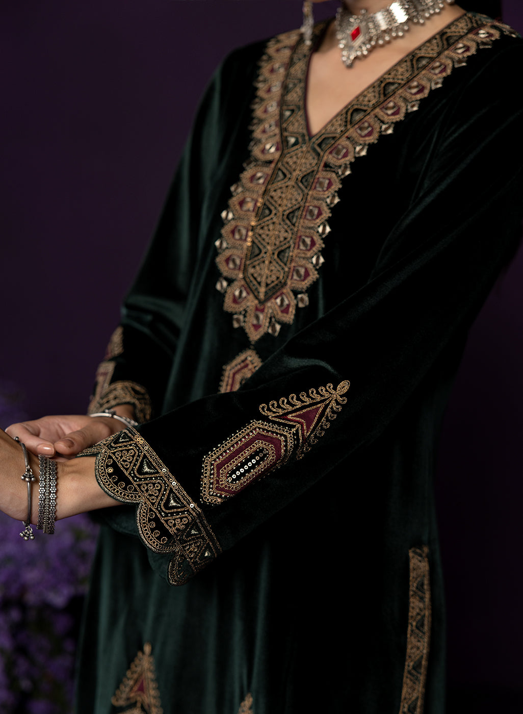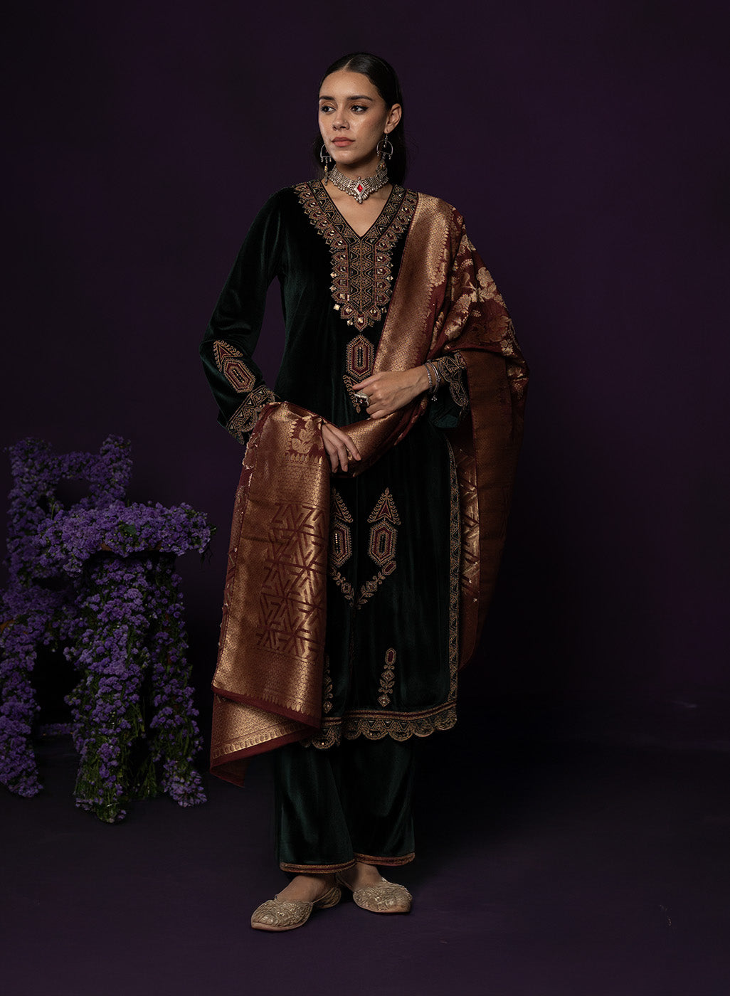 Koel Green Embroidered Velvet Suit Set with Banarasi Dupatta