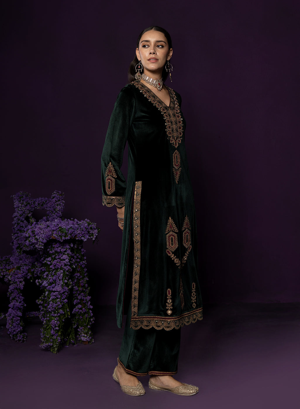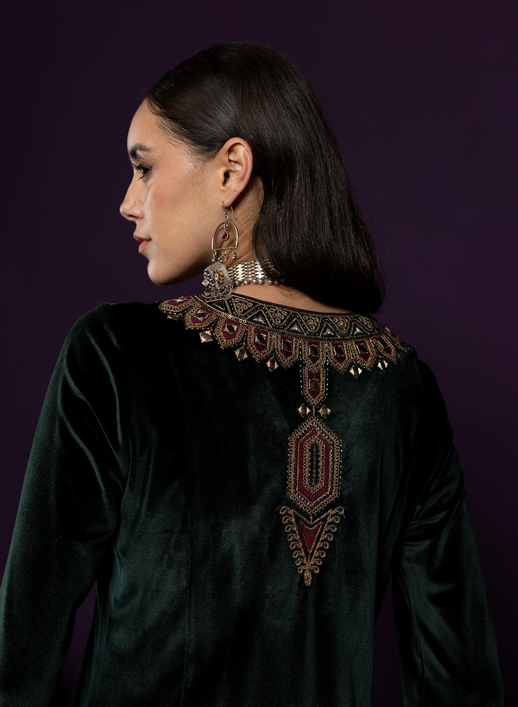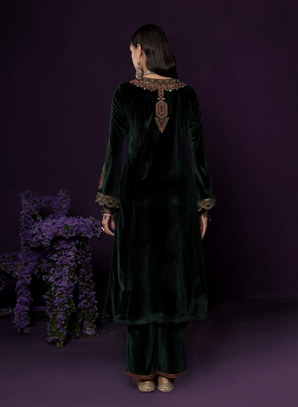 Koel Green Embroidered Velvet Suit Set with Banarasi Dupatta
