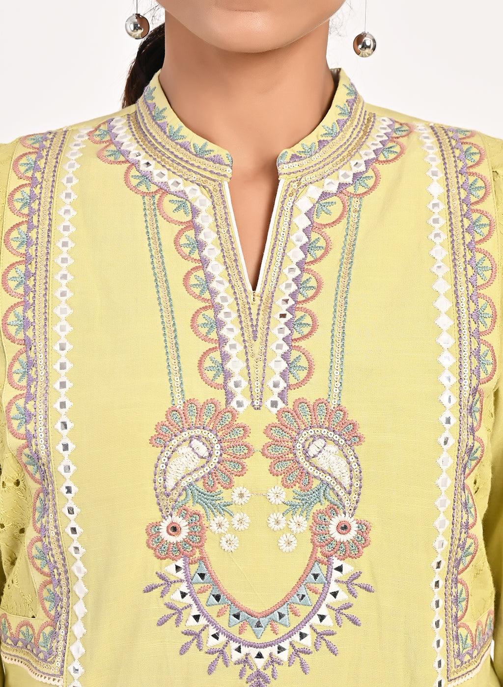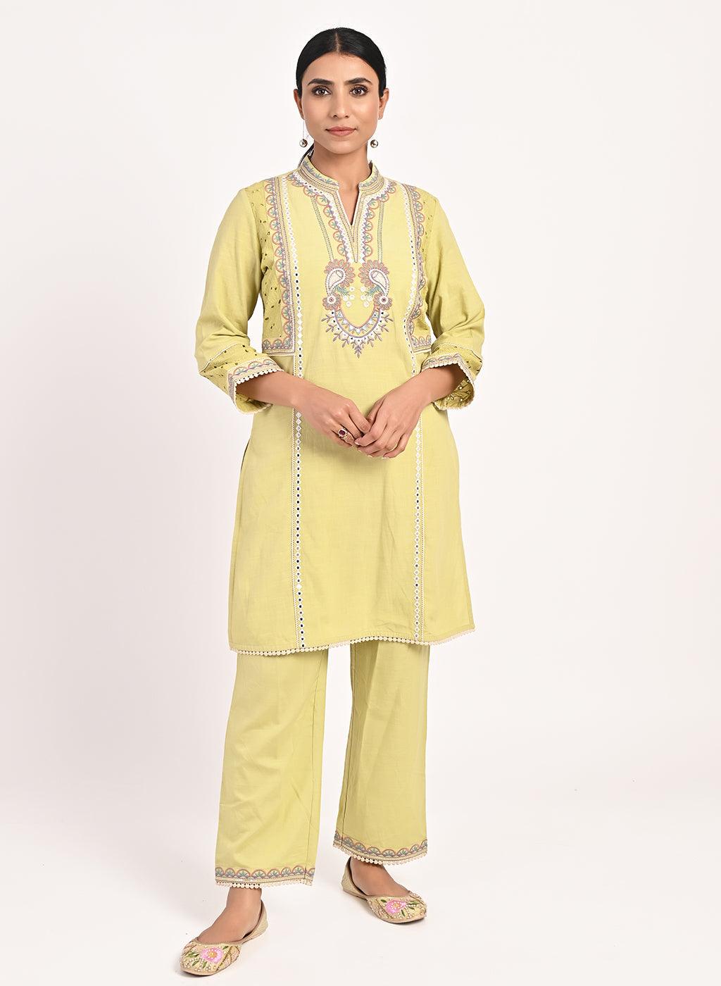 This Light green-coloured Schiffli embroidered co-ord set is precisely what you need to dazzle everyone this season. Accentuated by the dori detail on the front and schiffli embroidery on the sleeves, this cotton co-ord set will make you radiate charm. Complete the look with light makeup for that sophisticated look.