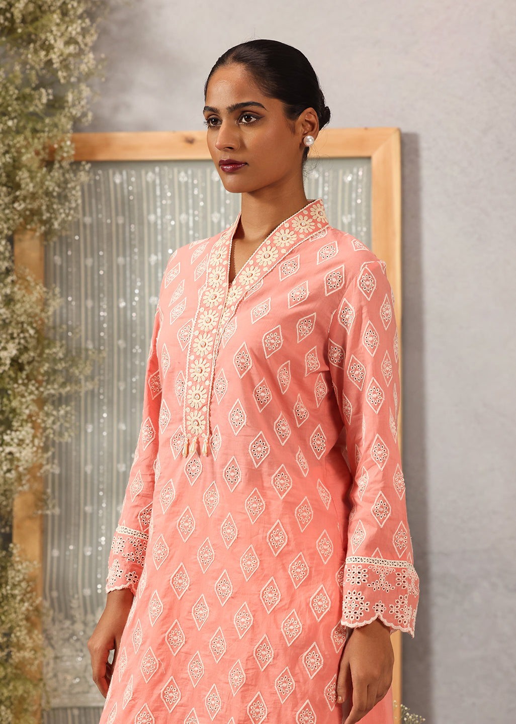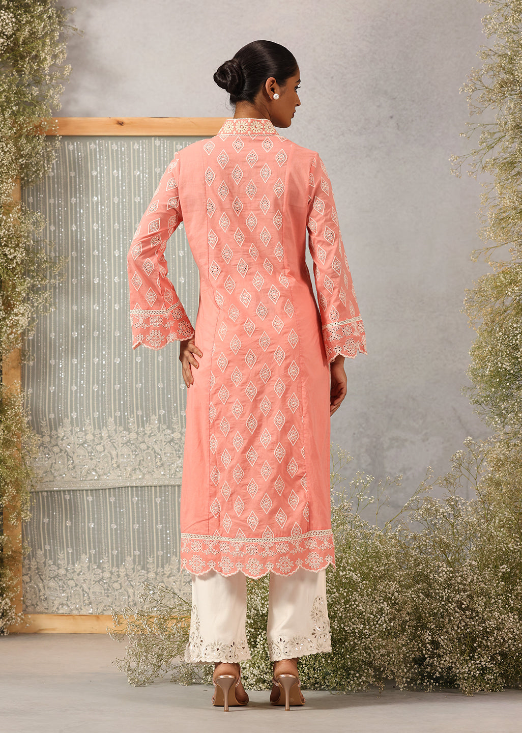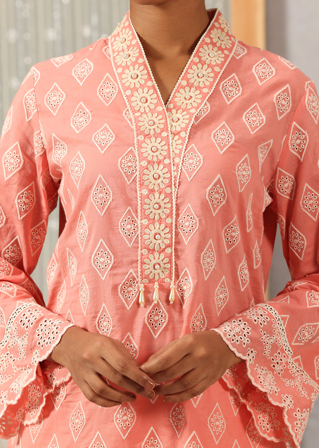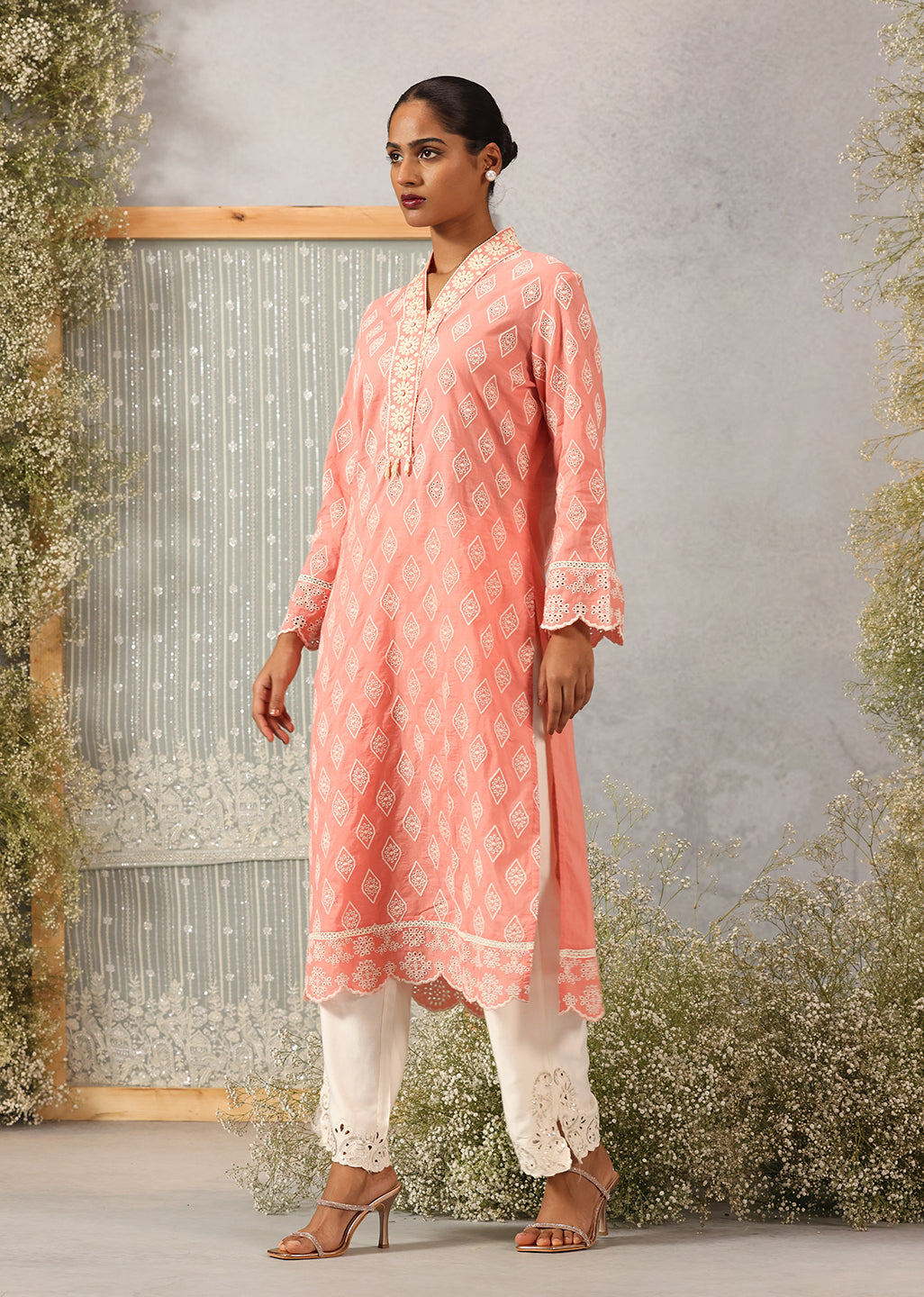 This summer, fill your styling capsule with this soothing peach-colored cotton Kurta from the house of Lakshita. Tailored in a straight-fitting silhouette from purely cotton fabric, this V-neck Kurti is covered with ethnic prints all over, while the decorative details covering the flared sleeves and the hem add a traditional flair. Pair it with contrasting palazzo pants and a pair of mojaris to look serene and relaxed even when the sun is up.