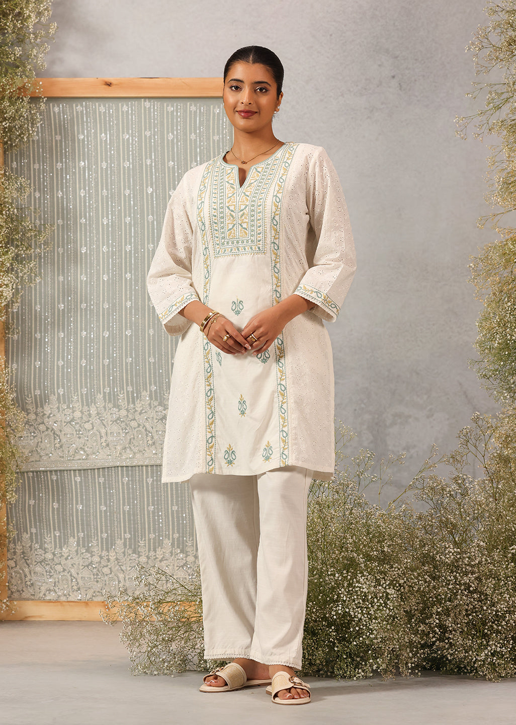 Amp up your style game with this pearl white embroidered kurta by Lakshita featuring a solid base with laid-out floral & paisley embroidered panels at the neckline and bodice. Crafted with the finest material, pair this kurta with a pair of off white palazzos or jeans for a casual or semi-formal look.