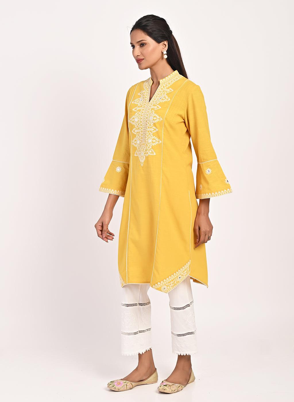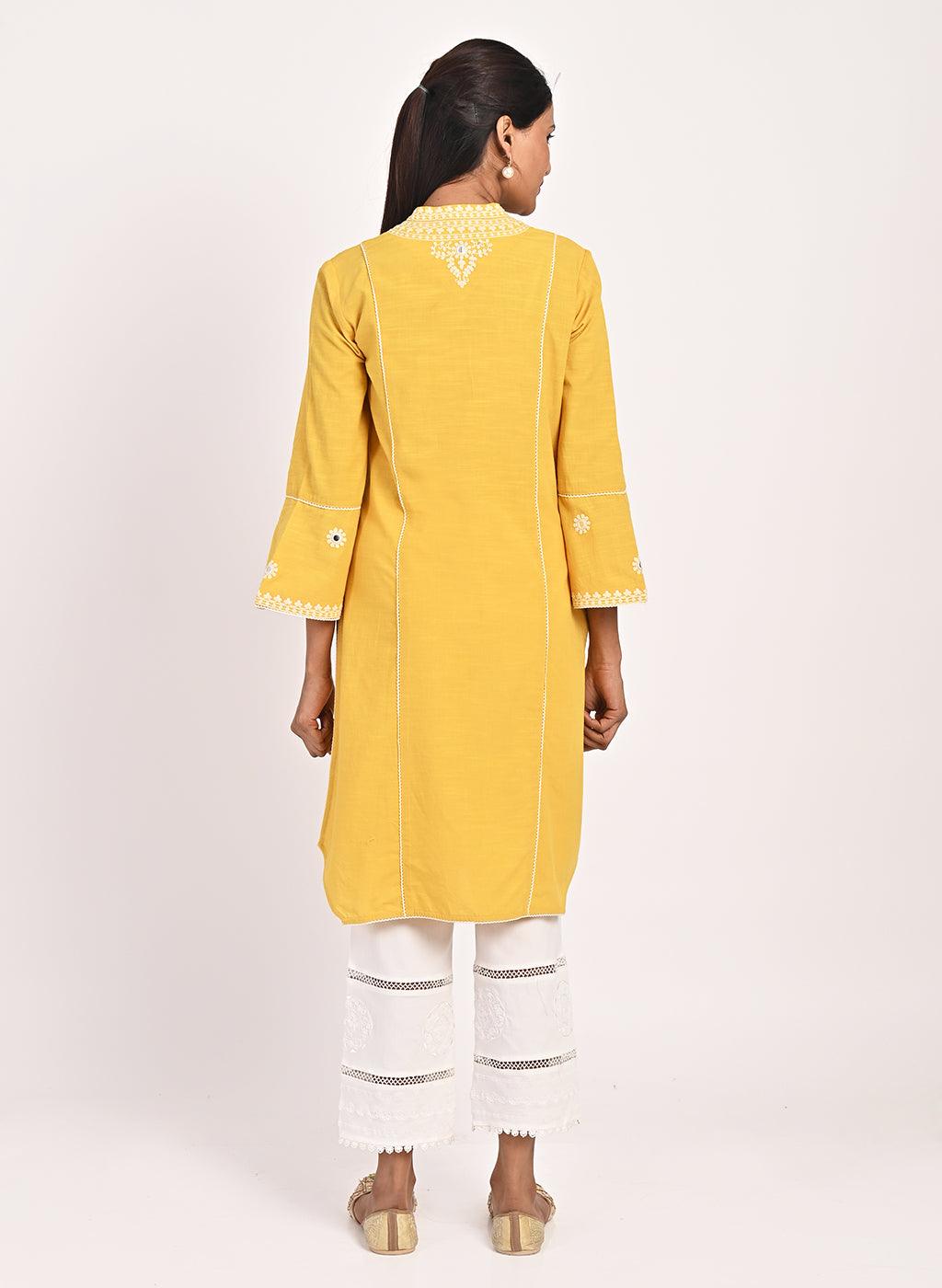 Yellow Mid-length Cotton Kurti for Women with Embroidery