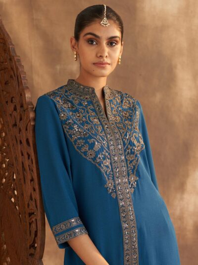D.Teal Kurta Set With Intricate Embroidery & Front Slit