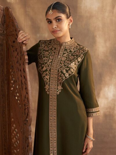 Olive Kurta Set With Intricate Embroidery & Front Slit
