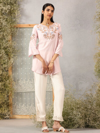 Pink Cotton Kurti with Floral Embroidery